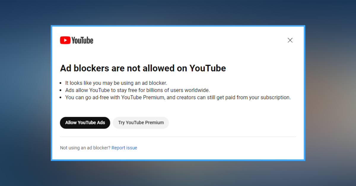 Uporabnik Reddit, ki je prvi poročal o tem, je pojasnil, da YouTube ob prikazu sporočila dejansko blokira predvajanje vseh videoposnetkov, razen če je AdBlocker deaktiviran. YouTube hkrati uporabniku predlaga, naj se naroči na storitev YouTube Premium, saj je ena izmed glavnih prednosti naročnine odstranitev vseh oglasov.
