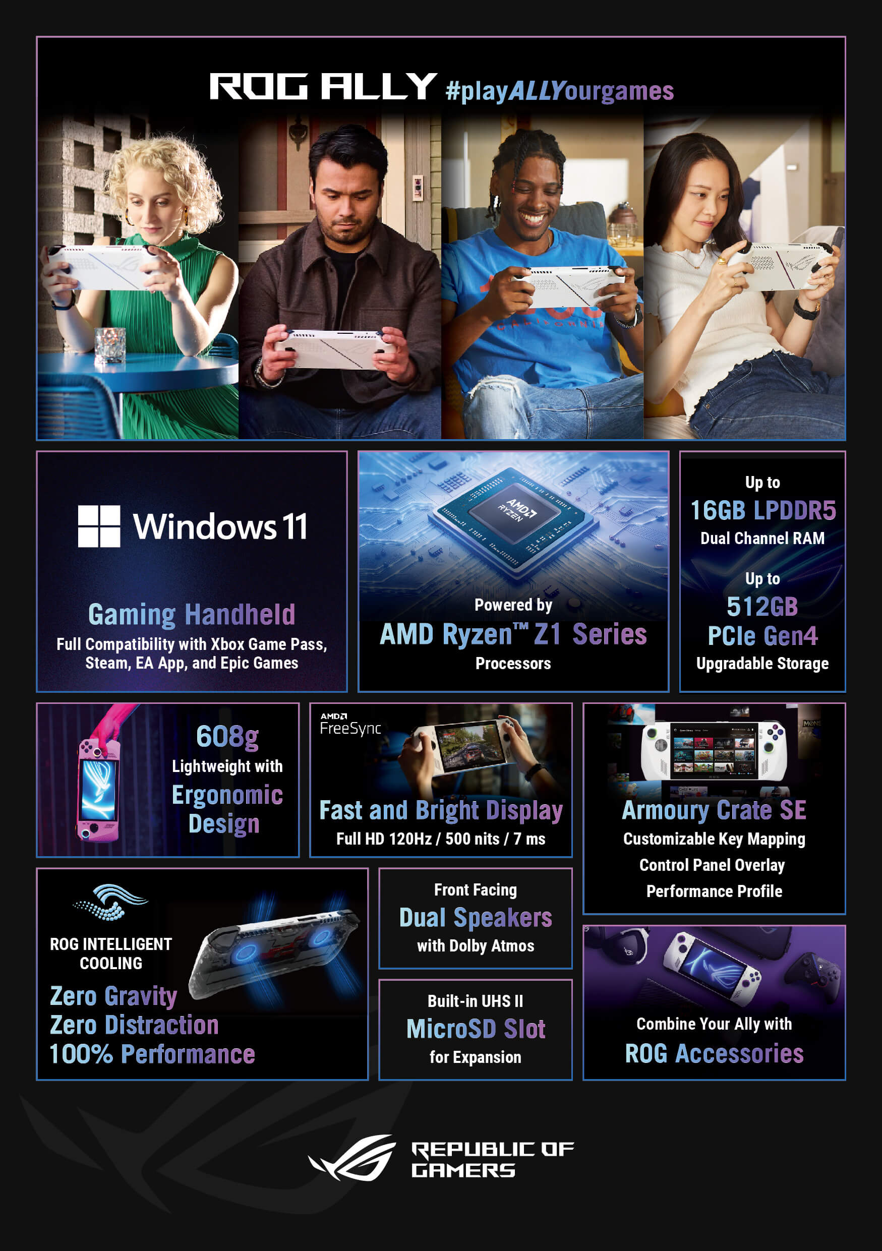 Družba ASUS Republic of Gamers (ROG) s ponosom predstavlja ROG Ally, izjemno zmogljiv nov igralni ročni računalnik z operacijskim sistemom Windows 11. S procesorjem AMD Ryzen™ serije Z1 lahko Ally z lahkoto premaguje igre AAA. Svetel zaslon na dotik z visoko stopnjo osveževanja zagotavlja, da igralci jasno vidijo vsebino tudi med igranjem na prostem. Ally je zaradi lahke 608 g težke zasnove in ergonomskih ročajev enostaven za prenašanje in celodnevno rokovanje.