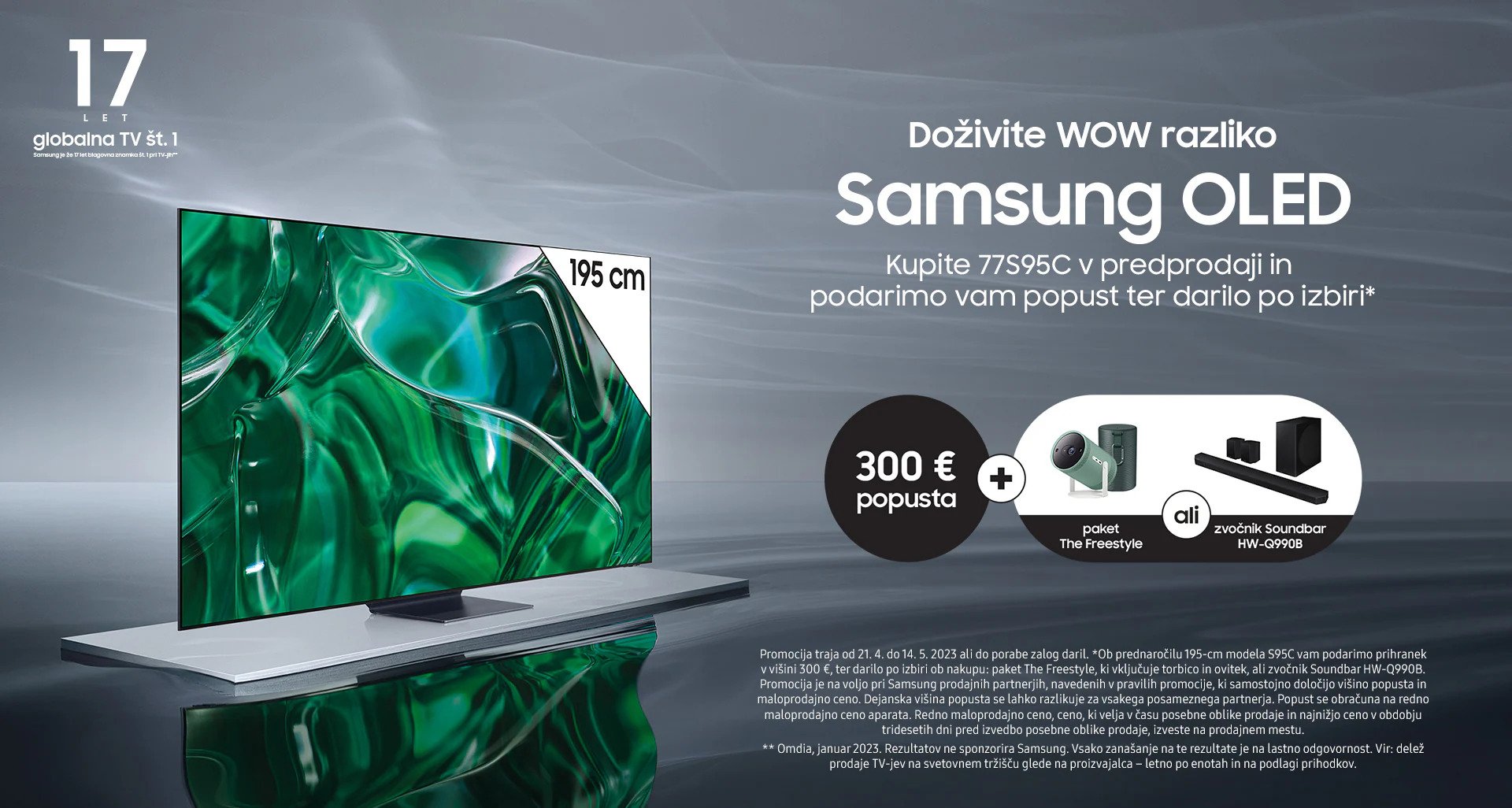 Samsung slovenskemu trgu predstavlja novo dimenzijo na področju OLED televizorjev in je za prednaročnike pripravil posebno ponudbo. V času prednaročila televizorja 195 cm (77″) S95C OLED 4K HDR Smart TV (2023) vam Samsung podarja prihranek v višini 300 evrov in darilo po izbiri. Izbirate lahko med paketom The Freestyle, ki vsebuje prenosni projektor The Freestyle, torbico in ovitek zanj, ali zvočnik Soundbar HW-Q990B.