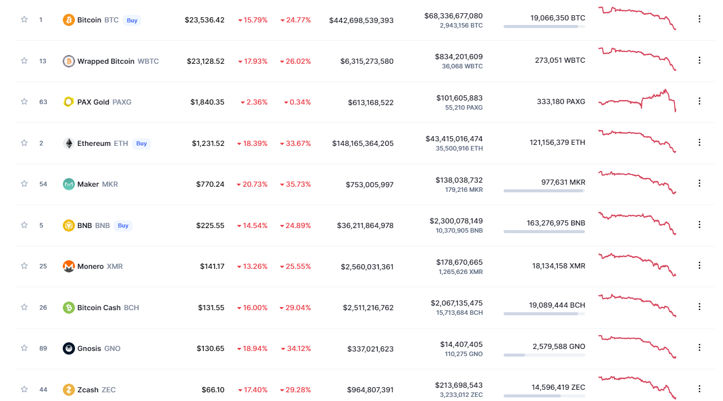 Bitcoin je padel pod 24. 000 dolarjev, s čimer so cene padle na raven, ki je nismo videli od decembra 2020. V času, ko to pišemo, je na dan padla za 13,6 %, v enem tednu pa je padla za 24 %. Še slabše kaže etru v 24 urah je padel za 18 %, v sedemdnevnem časovnem okviru pa za kar 37 %. Nekateri manjši altcoini so v enem dnevu izgubili 20 % vrednosti, skupna tržna vrednost vseh kriptovalut pa je zdaj nižja od 1 bilijona dolarjev. V ponedeljek so se prodajali tudi svetovni trgi, saj so jih spodbujali strahovi pred naraščajočo inflacijo, skorajšnjim zvišanjem obrestnih mer in možnostjo recesije v večjih gospodarstvih.
