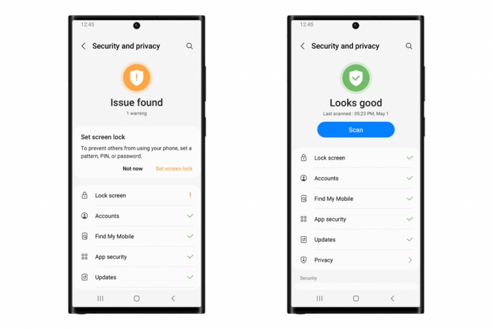 Menija za varnost in zaščito osebnih podatkov sta sedaj združena. To uporabnikom omogoča boljši vpogled v potencialno ogrožene podatke. Nadzorna plošča na enem mestu priročno prikaže stanje varnostnih elementov, uporabnikom omogoči hitro spreminjanje nastavitev in jim pomaga lažje upravljati s tveganji. Elementi, ki najbolj vplivajo na digitalno varnost – vključno z zaklenjenim zaslonom, računi, SmartThings Find, varnostjo aplikacij in posodobitvami – so zdaj dostopni na vrhu nadzorne plošče, s pomočjo intuitivnih rdečih, rumenih ali zelenih alarmov pa lahko že na prvi pogled odkrijete, kjer se pojavljajo potencialna varnostna tveganja. Nadgrajeno vozlišče vključuje takojšnje pozive za dejanja, kot so dovoljenja, zaradi katerih so odločitve o podatkih še bolj pregledne.