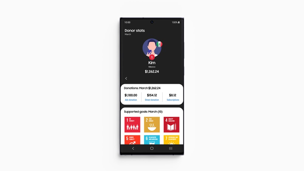 Aplikacija Samsung Global Goals je učinkovit način, kako lahko skupnost Galaxy sodeluje pri podpori globalnih ciljev. Pred nekaj meseci je bil dosežen nov mejnik donacij, saj je bilo prek aplikacije do zdaj zbranih 10 milijonov ameriških dolarjev, ki so bili podarjeni za pomoč Programu Združenih narodov za razvoj (UNDP) pri spodbujanju odpornosti in pospeševanju napredka pri uresničevanju ciljev. Samsung upa, da bo Lestvica donacij pomagala nadaljevati ta zagon z novim, zabavnim in interaktivnim načinom, s katerim lahko skupnost Galaxy prispeva k ciljem, ki ji največ pomenijo.