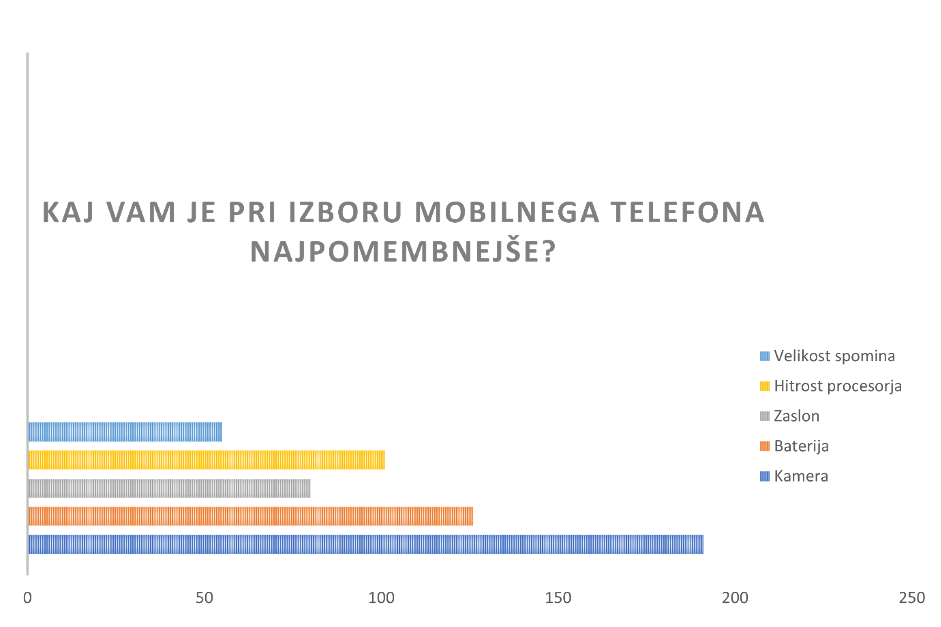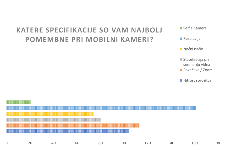 - Pri mobilni kameri odločilno vlogo igrata resolucija in povečava/ zoom (49%), hitrost sprožitve in stabilizacija pri snemanju videa. Najmanj pomembni specifikaciji sta nočni način in selfie kamera.