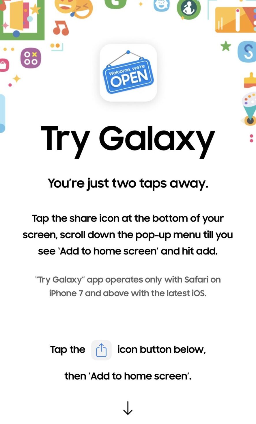 Z obiskom spletnega mesta Try Galaxy lahko lastniki iPhona “namestijo” spletno aplikacijo in jo dodajo na domači zaslon svojega telefona. Ko to storijo, se z enostavnim zagonom spletne aplikacije vmesnik telefona iPhone spremeni v vmesnik telefona Samsung Galaxy. Uporabnikom je na voljo kratki vodnik, ki jih nauči, kako krmariti po vmesniku telefona s sistemom Android, nato pa lahko sami preizkusijo storitve.