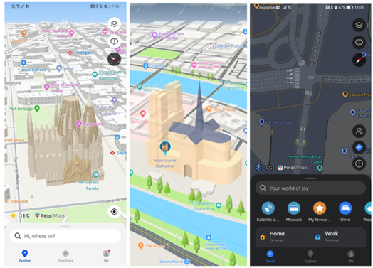 Zemljevidi Petal Maps zmorejo zelo podrobno upodobiti ceste, zgradbe, vremenske učinke in nočne prizore z barvami, ki ustrezajo resničnemu svetu. To nazorno poustvari resnični svet v digitalnih zemljevidih, kar uporabnikom pomaga pri njihovem razumevanju in krmarjenju po njih. Aplikacija trenutno podpira podroben 3D-prikaz skoraj sto znamenitosti. Na Huaweievem razstavnem prostoru so obiskovalci kongresa lahko uporabili Petal Maps za raziskovanje znamenitih zgradb Barcelone, kot sta Sagrada Família in Casa Milà, ki so v digitalnih zemljevidih platforme poustvarjeni v 3D. Petal Maps zmore prikazati tudi dinamične vremenske učinke, kot so oblaki, sonce in nevihte, glede na lokalno vreme, prav tako pa lahko prikaže ulične luči in druge posebne podrobnosti zgradbe ponoči.