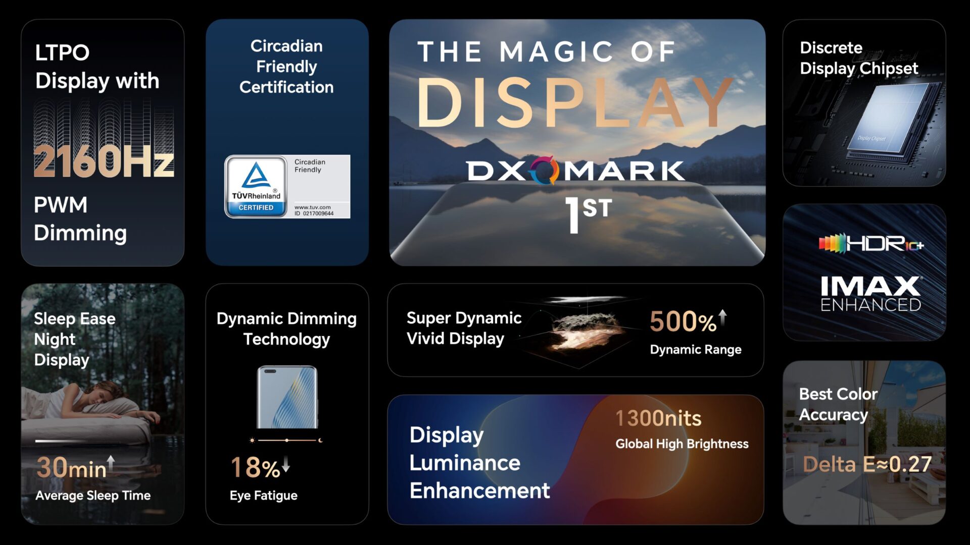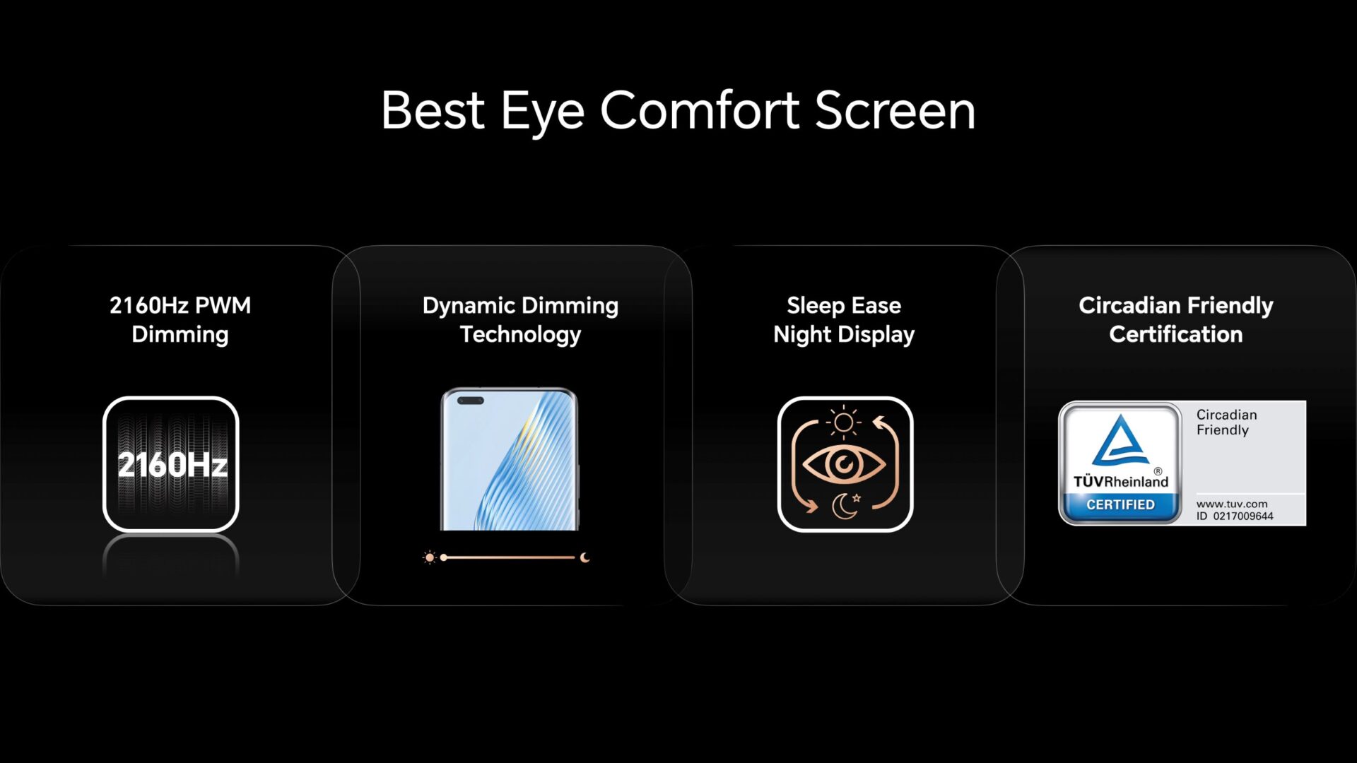 HONOR Magic5 Pro zmanjšuje obremenitev oči uporabnika in se ponaša z nizko emisijo modre svetlobe, kar je potrdil TÜV Rheinland​, in dinamično zatemnitvijo, ki simulira naravno svetlobo za zmanjšanje utrujenosti oči. Druge inovativne funkcije za udobje oči vključujejo cirkadiani nočni zaslon za boljšo kakovost spanja in prvi zaslon LTPO v industriji s tehnologijo zatemnitve 2160Hz Pulse Width Modulation (PWM) za zmanjšanje utripanja zaslona, ​​kot nalašč za vse, ki preživijo dolge ure pred svojim pametnim telefonom.