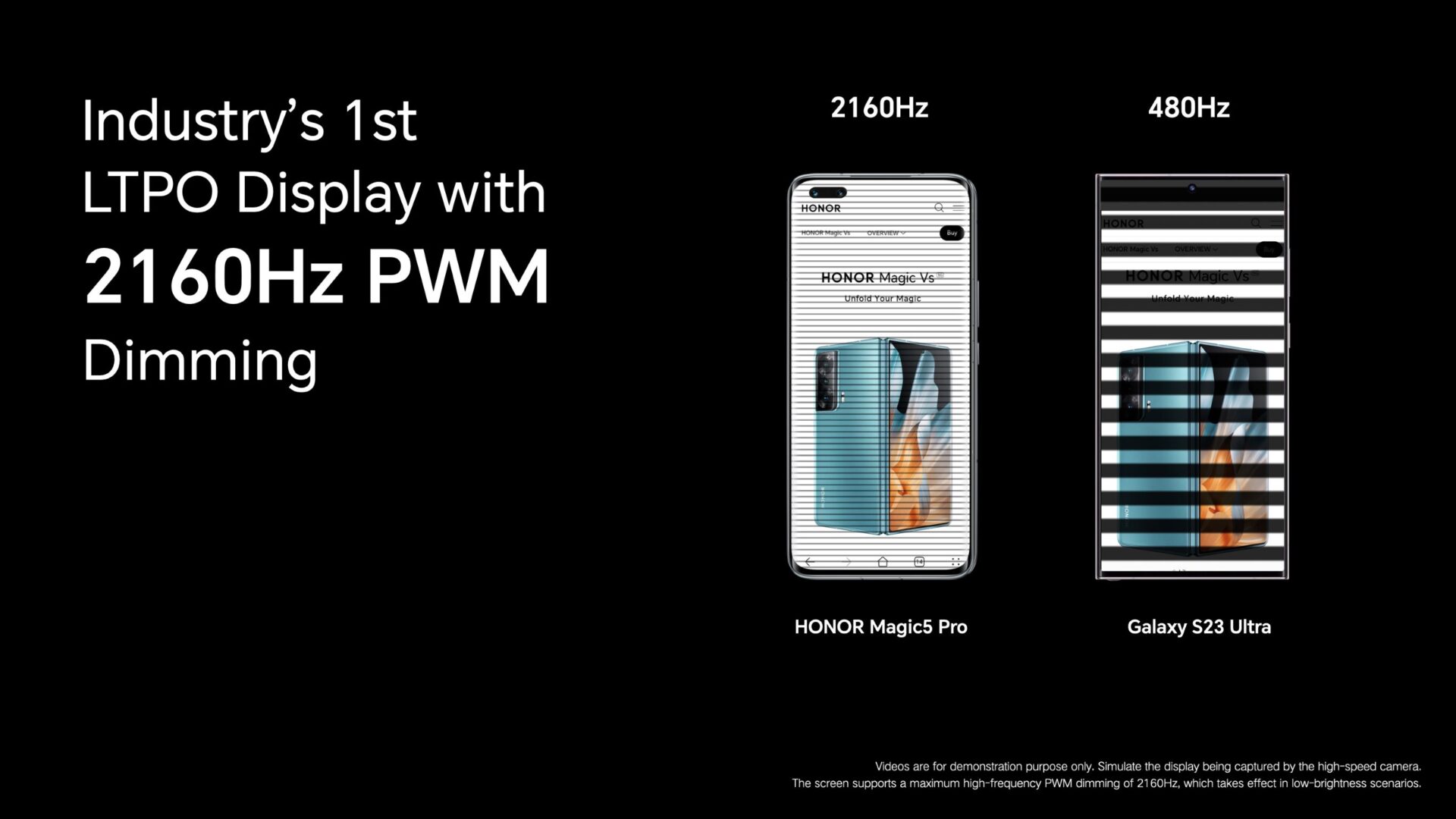 HONOR Magic Vs je opremljen s profesionalnimi rešitvami za udobje oči, ima dinamično zatemnitev, cirkadiani nočni prikaz in zatemnitev s 1920 Hz pulzno širokopasovno modulacijo (PWM), kar je najvišja frekvenca, dosežena na trgu zložljivih pametnih telefonov, in tako učinkovito zmanjšuje učinke digitalne obremenitve oči in utrujenosti.