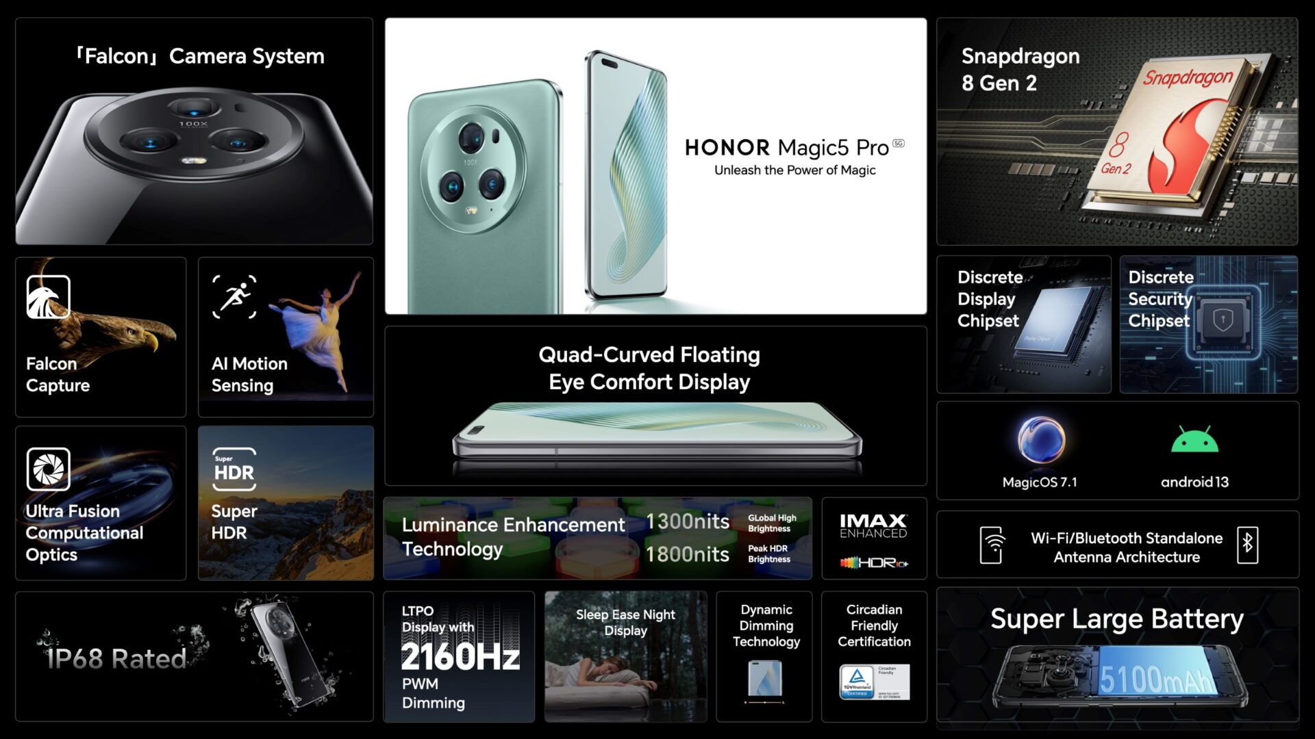 HONOR Magic5 Pro predstavlja edinstven štirikrat ukrivljeni plavajoči 6,81-palčni zaslon tipa LTPO, ki zagotavlja poglobljeno izkušnjo gledanja, ne glede na to, ali uporabniki brskajo, igrajo igre ali berejo. Serija HONOR Magic5 je opremljena z novo tehnologijo za izboljšanje svetilnosti zaslona, ki zagotavlja največjo svetilnost HDR 1800 nit, kar zagotavlja jasne slike tudi pri močni sončni svetlobi. Z dvojno kalibracijo osvetlitve za tipično svetilnost 120 nit v notranjih prostorih in 800 nit na prostem HONOR Magic5 Pro zagotavlja vrhunsko barvno natančnost zaslona.